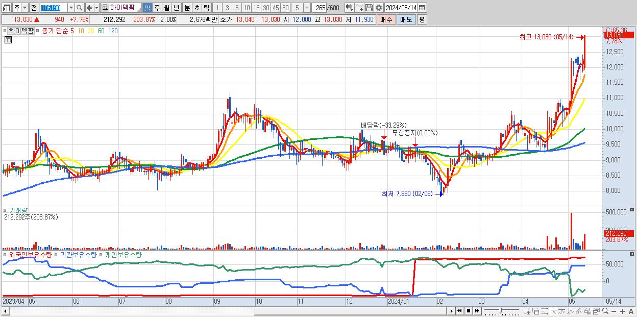 - 하이텍팜 (13,030원 ▲ 7.78% , 시총: 1,386억, 거래량: 212,292, 거래대금:27억, KOSDAQ)