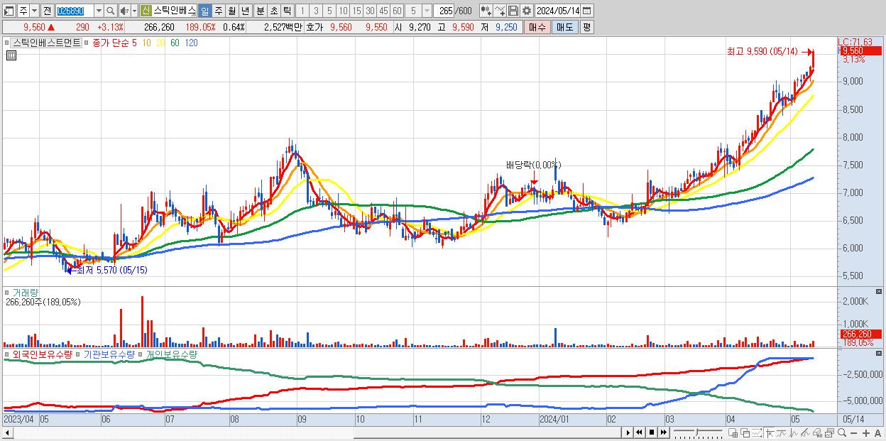 - 스틱인베스트먼트 (9,560원 ▲ 3.13% , 시총: 3,984억, 거래량: 266,260, 거래대금:25억, KOSPI)
