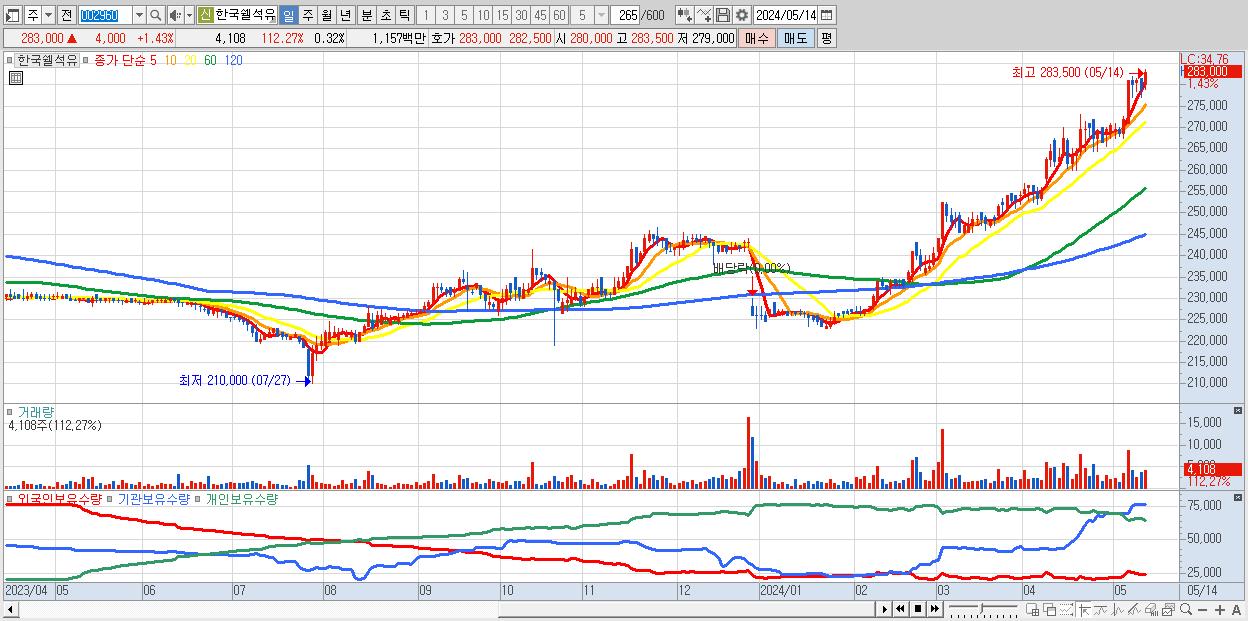 - 한국쉘석유 (283,000원 ▲ 1.43% , 시총: 3,679억, 거래량: 4,108, 거래대금:12억, KOSPI)