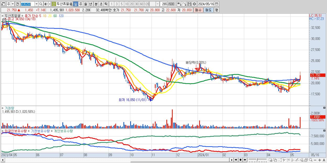 - 두산퓨얼셀 (21,750원 ▲ 7.14% , 시총: 14,245억, 외국인 순매수 거래금:77억)