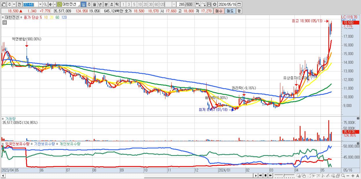 - 대한전선 (18,580원 ▲ 7.77% , 시총: 34,642억, 외국인 순매수 거래금:195억)