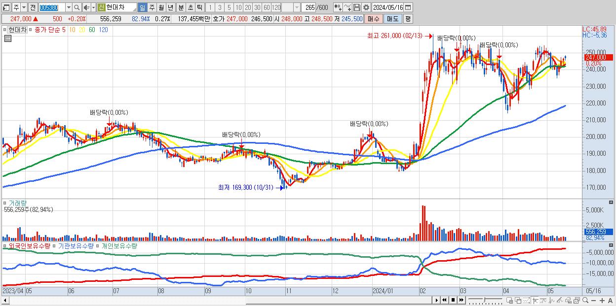 - 현대차 (247,000원 ▲ 0.2% , 시총: 517,258억, 외국인 순매수 거래금:188억)