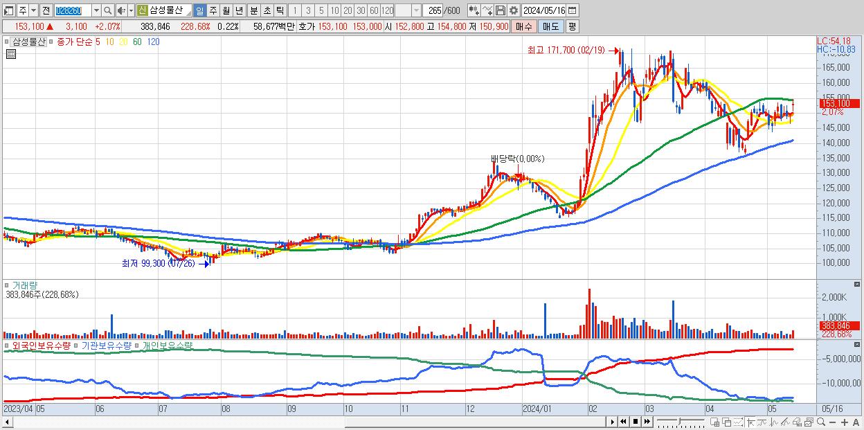 - 삼성물산 (153,100원 ▲ 2.07% , 시총: 272,187억, 외국인 순매수 거래금:167억)