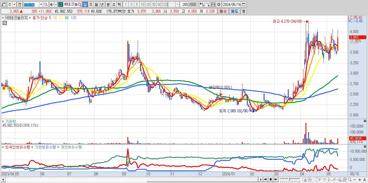 - HB테크놀러지 (3,865원 ▲ 11.06% , 시총: 3,583억, 외국인 순매수 거래금:130억)