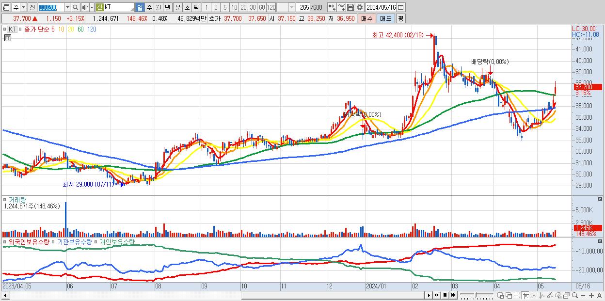 - KT (37,700원 ▲ 3.15% , 시총: 96,951억, 외국인 순매수 거래금:118억)