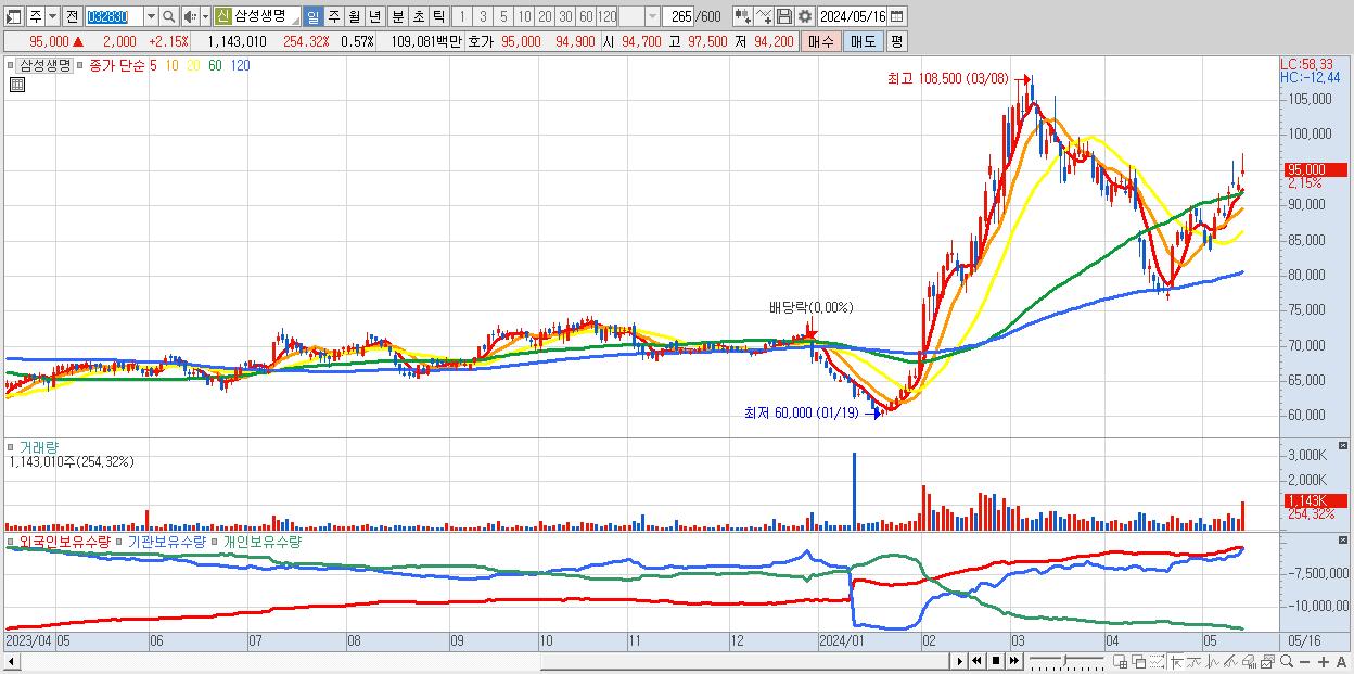 - 삼성생명 (95,000원 ▲ 2.15% , 시총: 190,000억, 외국인 순매수 거래금:281억)