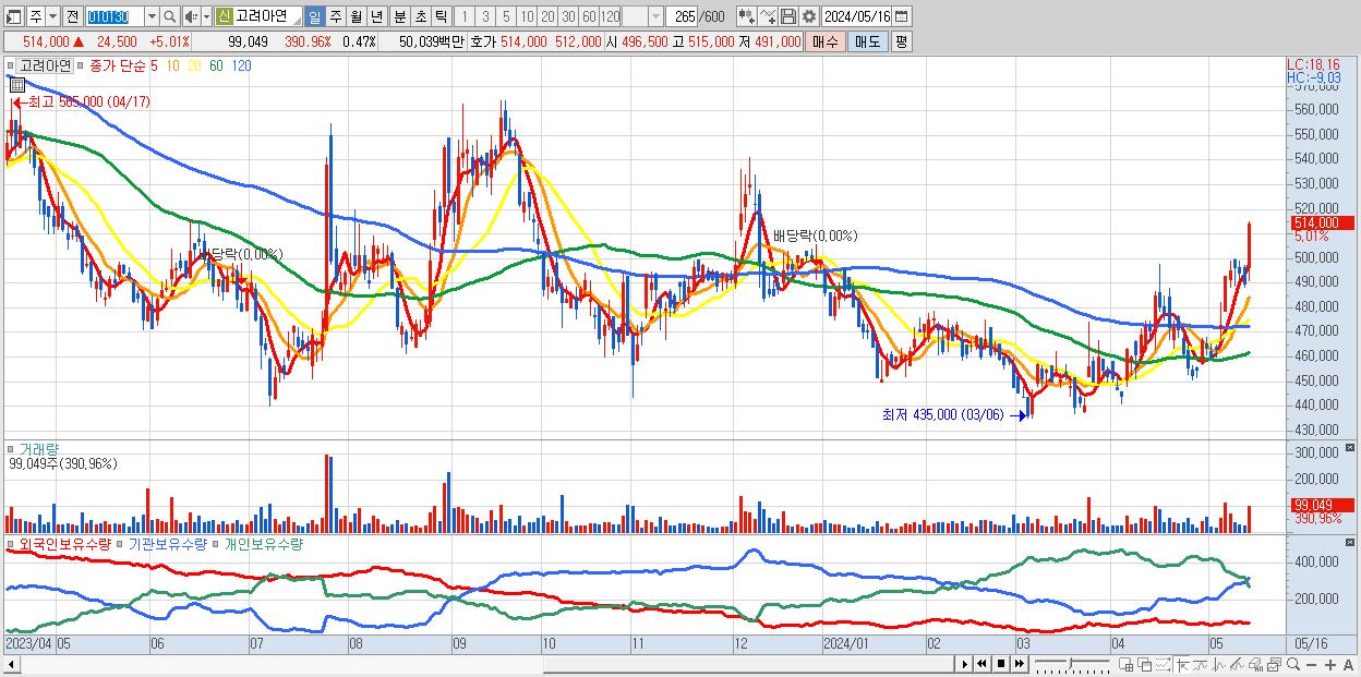 - 고려아연 (514,000원 ▲ 5.01% , 시총: 107,470억, 외국인 순매수 거래금:157억)