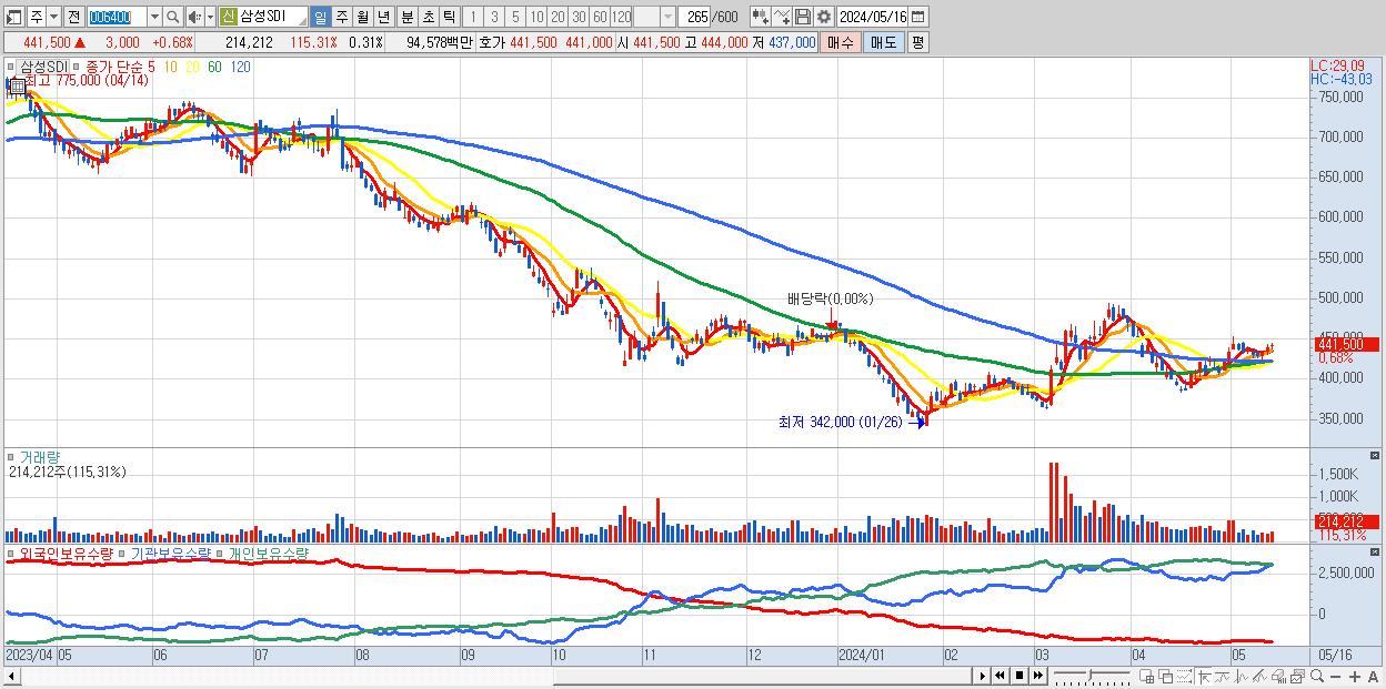 - 삼성SDI (441,500원 ▲ 0.68% , 시총: 303,595억, 외국인 순매수 거래금:106억)