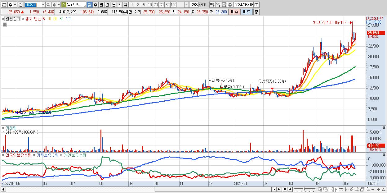 - 일진전기 (25,650원 ▲ 6.43% , 시총: 12,231억, 외국인 순매수 거래금:136억)