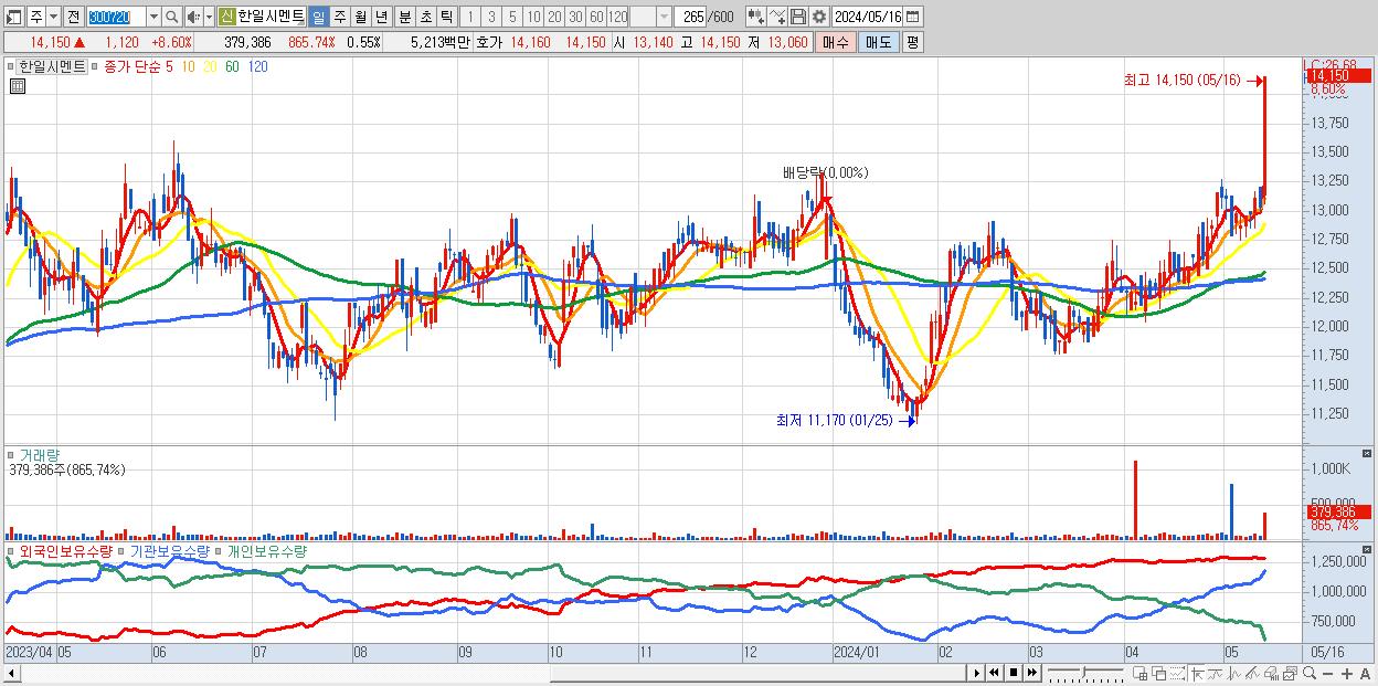 - 한일시멘트 (14,150원 ▲ 8.6% , 시총: 9,801억, 거래량: 379,386, 거래대금:52억, KOSPI)