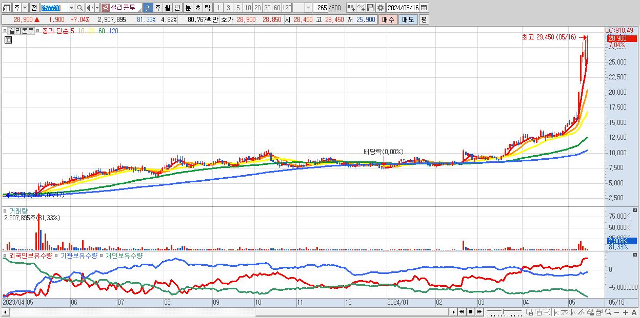 - 실리콘투 (28,900원 ▲ 7.04% , 시총: 17,452억, 거래량: 2,907,895, 거래대금:808억, KOSDAQ)