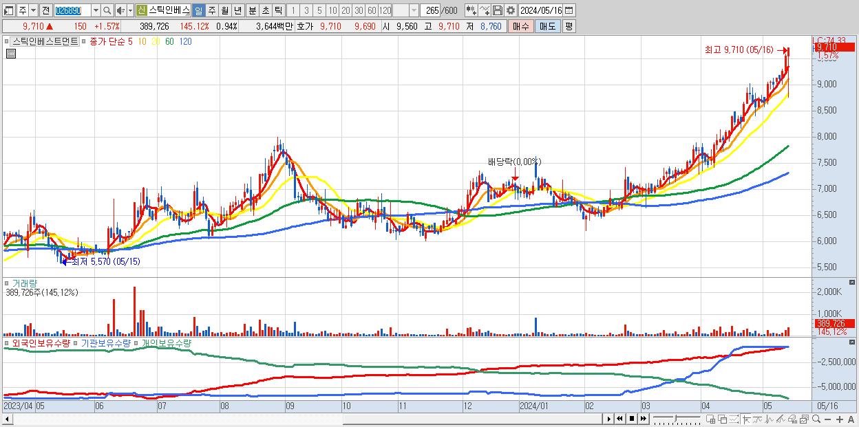 - 스틱인베스트먼트 (9,710원 ▲ 1.57% , 시총: 4,047억, 거래량: 389,726, 거래대금:36억, KOSPI)