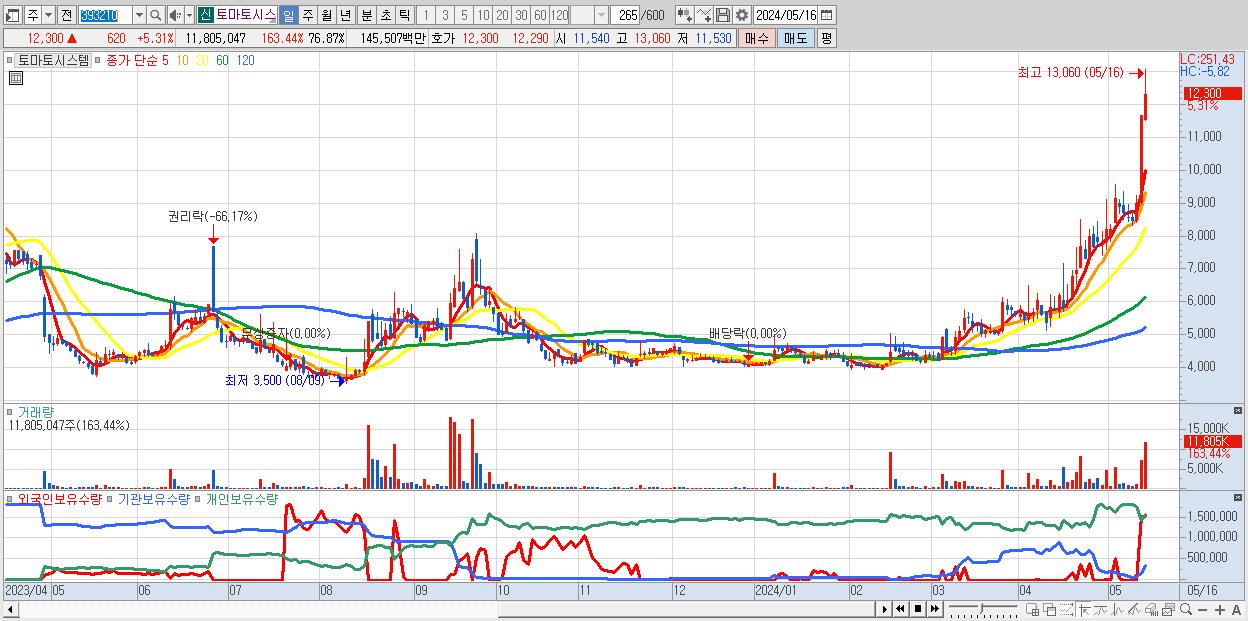 - 토마토시스템 (12,300원 ▲ 5.31% , 시총: 1,889억, 거래량: 11,805,047, 거래대금:1,455억, KOSDAQ)