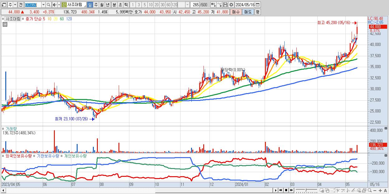 - 사조대림 (44,000원 ▲ 8.37% , 시총: 4,032억, 거래량: 136,723, 거래대금:60억, KOSPI)
