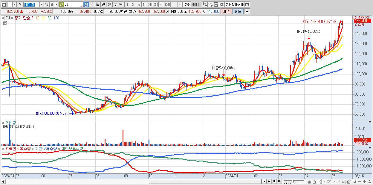 - CJ (152,700원 ▲ 2.28% , 시총: 44,553억, 거래량: 165,892, 거래대금:251억, KOSPI)