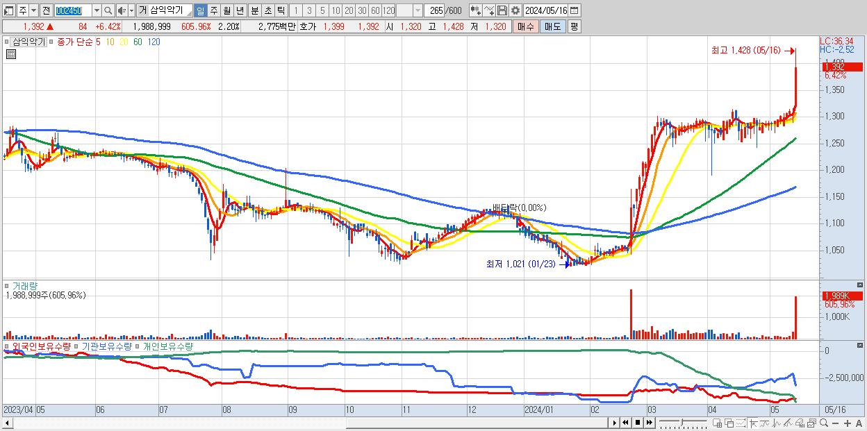 - 삼익악기 (1,392원 ▲ 6.42% , 시총: 1,260억, 거래량: 1,988,999, 거래대금:28억, KOSPI)