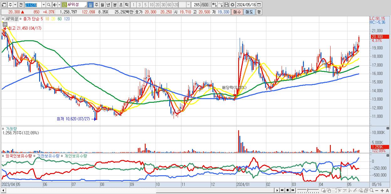 - AP위성 (20,300원 ▲ 4.37% , 시총: 3,062억, 거래량: 1,258,797, 거래대금:253억, KOSDAQ)