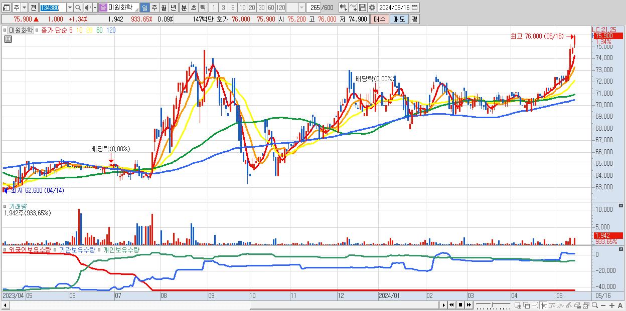 - 미원화학 (75,900원 ▲ 1.34% , 시총: 1,669억, 거래량: 1,942, 거래대금:1억, KOSPI)