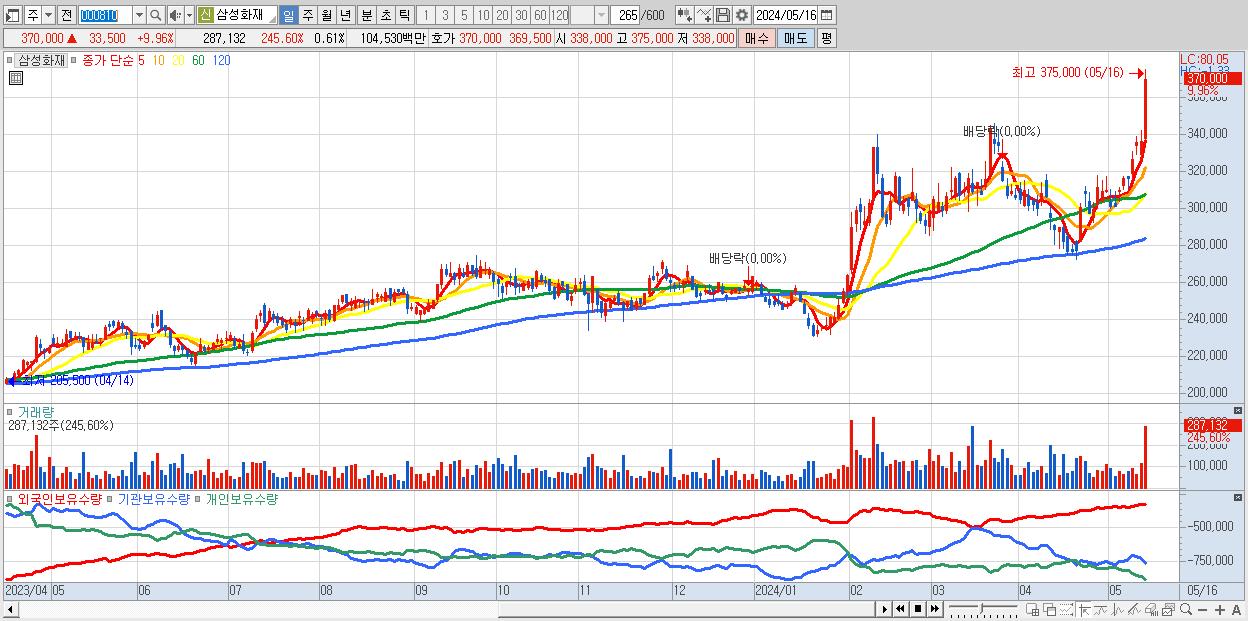 - 삼성화재 (370,000원 ▲ 9.96% , 시총: 175,287억, 거래량: 287,132, 거래대금:1,045억, KOSPI)