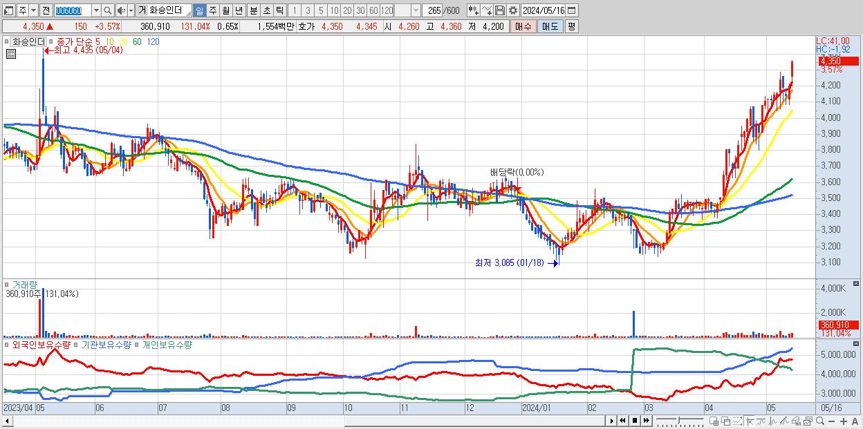 - 화승인더 (4,350원 ▲ 3.57% , 시총: 2,406억, 거래량: 360,910, 거래대금:16억, KOSPI)