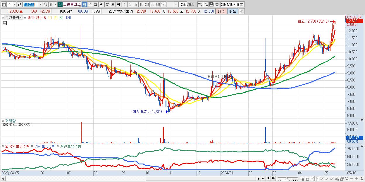 - 그린플러스 (12,690원 ▲ 2.09% , 시총: 1,373억, 거래량: 188,947, 거래대금:24억, KOSDAQ)