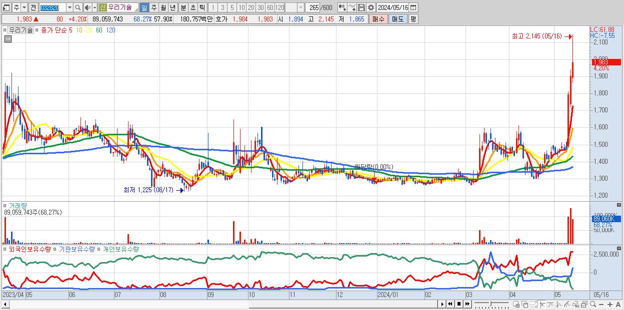 - 우리기술 (1,983원 ▲ 4.2% , 시총: 3,050억, 거래량: 89,059,743, 거래대금:1,808억, KOSDAQ)