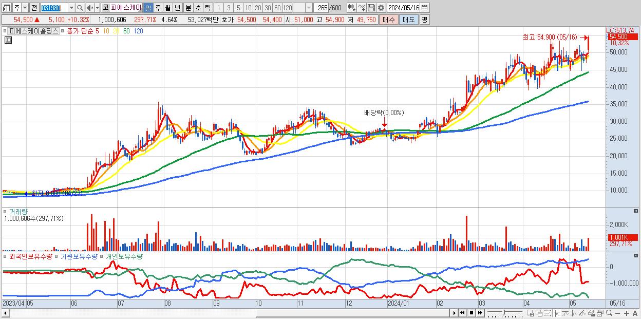 - 피에스케이홀딩스 (54,500원 ▲ 10.32% , 시총: 11,752억, 거래량: 1,000,606, 거래대금:530억, KOSDAQ)