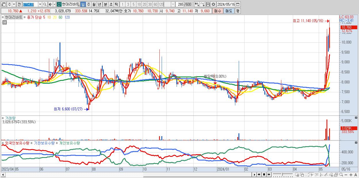 - 현대리바트 (10,760원 ▲ 12.67% , 시총: 2,210억, 거래량: 3,028,679, 거래대금:320억, KOSPI)