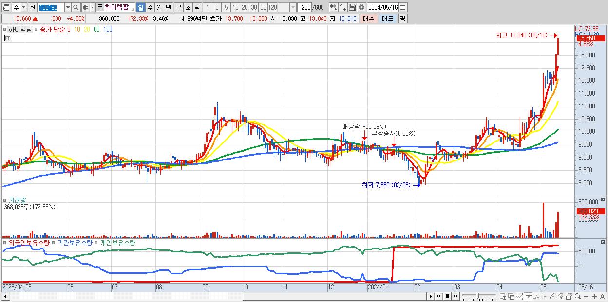 - 하이텍팜 (13,660원 ▲ 4.83% , 시총: 1,452억, 거래량: 368,023, 거래대금:50억, KOSDAQ)