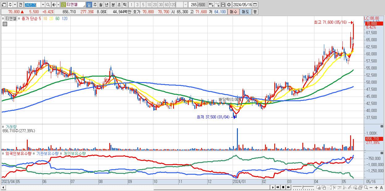 - 티앤엘 (70,800원 ▲ 8.42% , 시총: 5,755억, 거래량: 656,710, 거래대금:449억, KOSDAQ)