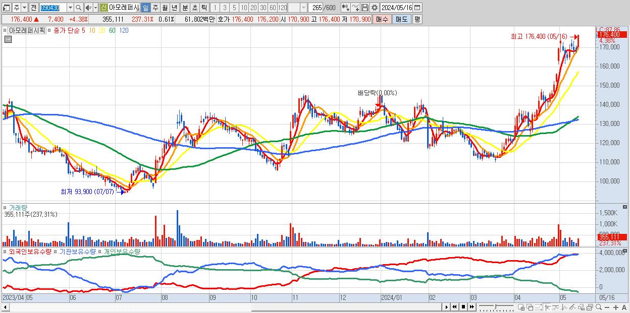 - 아모레퍼시픽 (176,400원 ▲ 4.38% , 시총: 103,181억, 거래량: 355,111, 거래대금:618억, KOSPI)