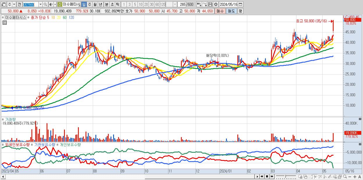 - 이수페타시스 (50,800원 ▲ 18.83% , 시총: 32,129억, 거래량: 19,090,409, 거래대금:9,329억, KOSPI)