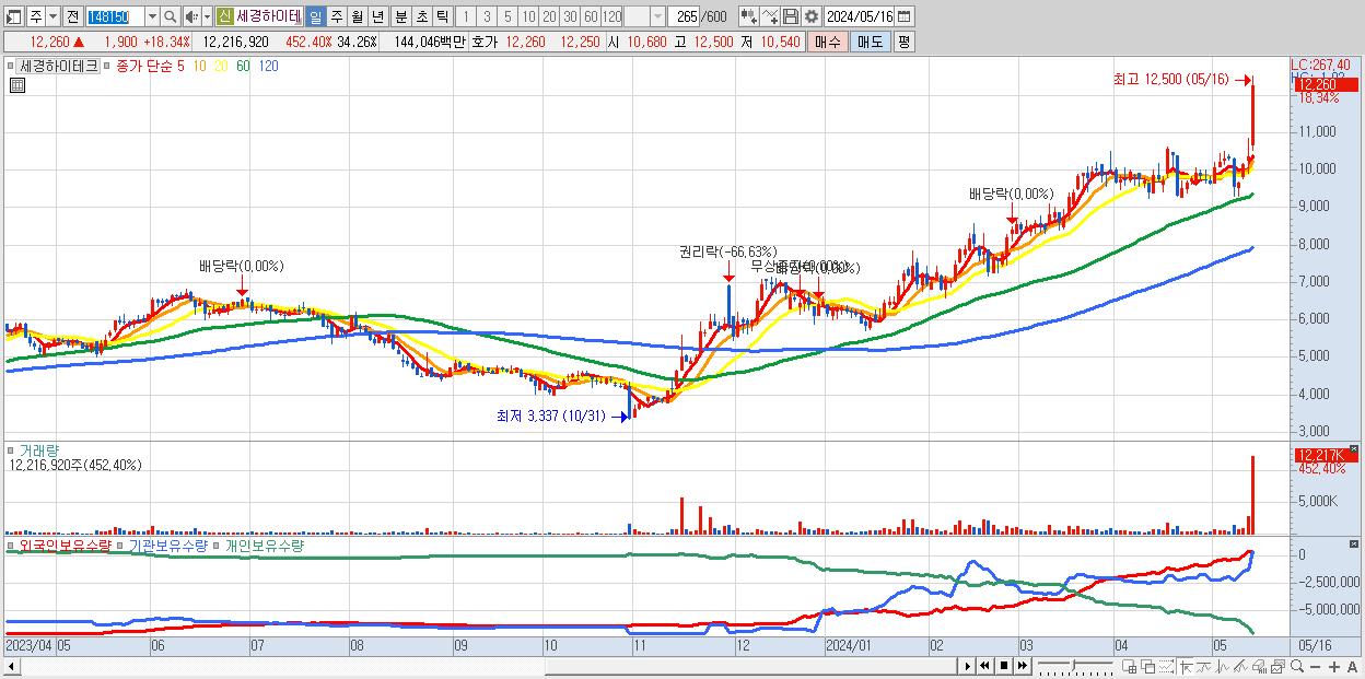 - 세경하이테크 (12,260원 ▲ 18.34% , 시총: 4,372억, 거래량: 12,216,920, 거래대금:1,440억, KOSDAQ)