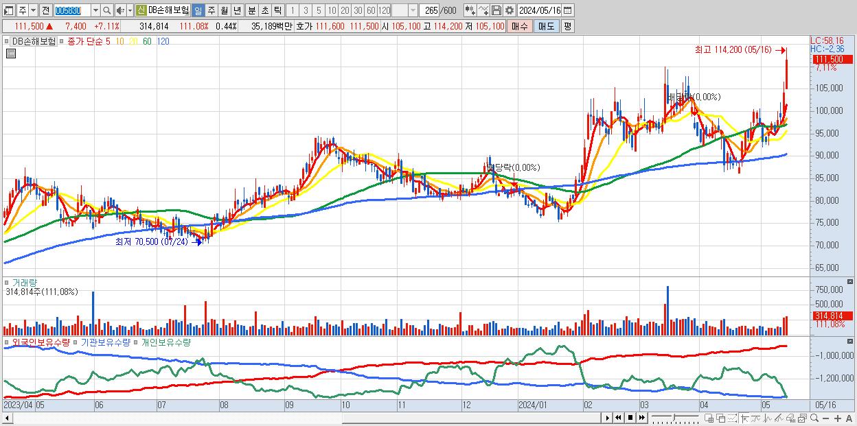 - DB손해보험 (111,500원 ▲ 7.11% , 시총: 78,942억, 거래량: 315,821, 거래대금:353억, KOSPI)
