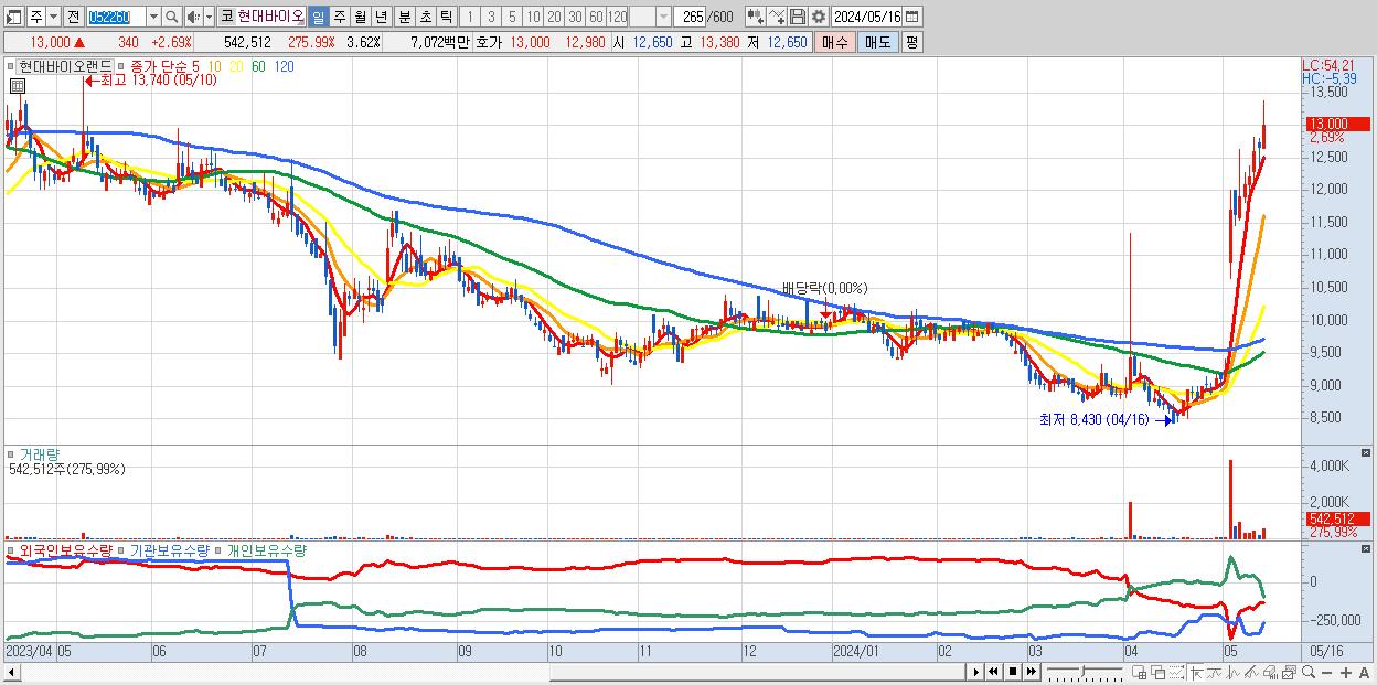 - 현대바이오랜드 (13,000원 ▲ 2.69% , 시총: 1,950억, 거래량: 542,512, 거래대금:71억, KOSDAQ)