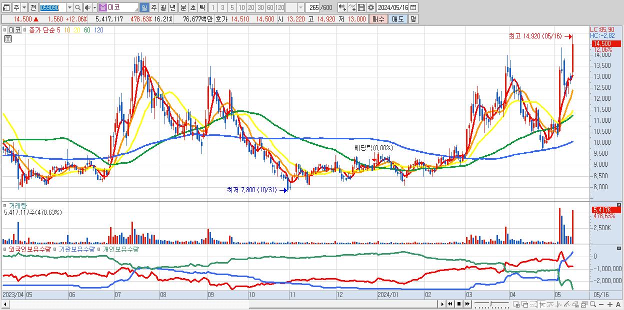 - 미코 (14,500원 ▲ 12.06% , 시총: 4,845억, 거래량: 5,417,117, 거래대금:767억, KOSDAQ)