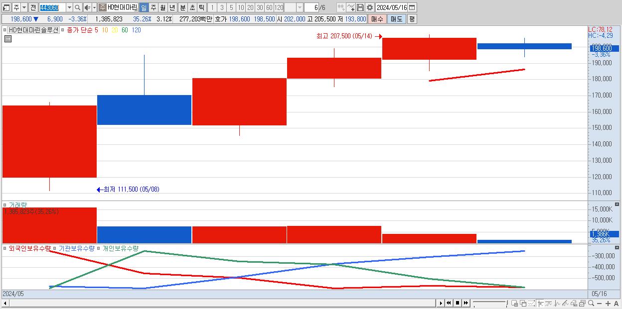- HD현대마린솔루션 (198,600원 ▼ -3.36% , 시총: 88,278억, 거래량: 1,385,823, 거래대금:2,772억)