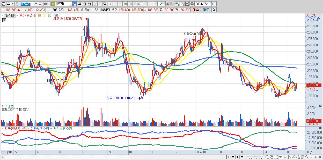 - NAVER (188,500원 ▲ 2.22% , 시총: 306,140억, 거래량: 805,720, 거래대금:1,521억)
