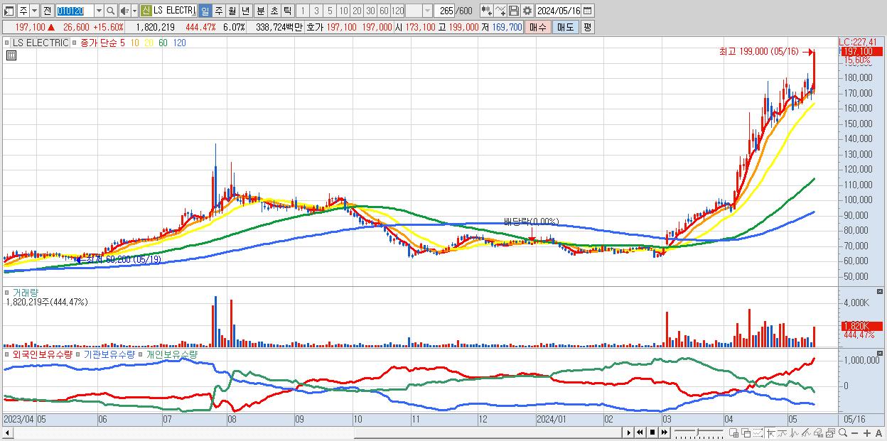 - LS ELECTRIC (197,100원 ▲ 15.6% , 시총: 59,130억, 거래량: 1,820,219, 거래대금:3,387억)