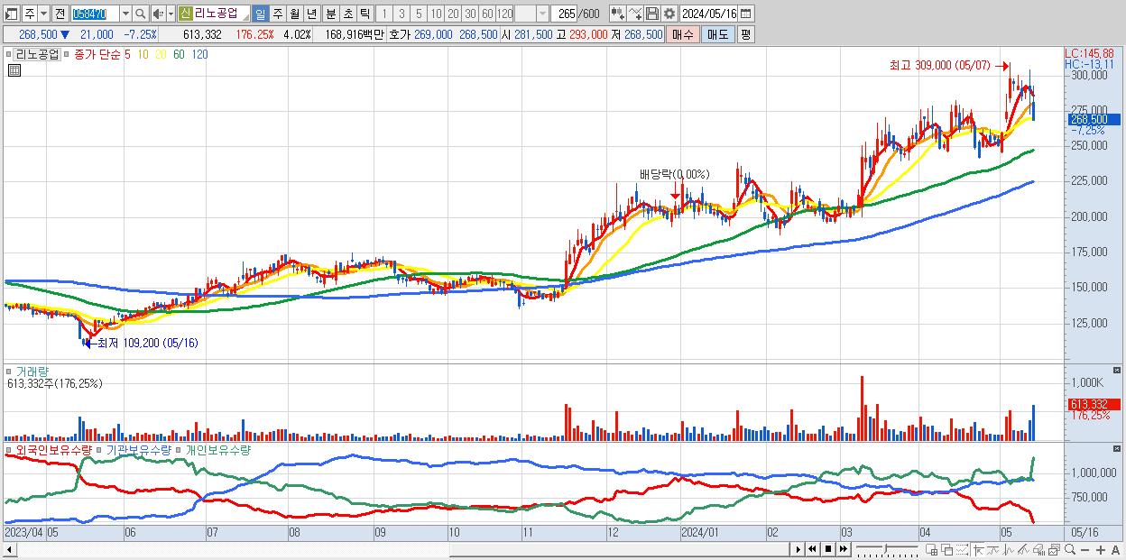 - 리노공업 (268,500원 ▼ -7.25% , 시총: 40,926억, 거래량: 613,332, 거래대금:1,689억)