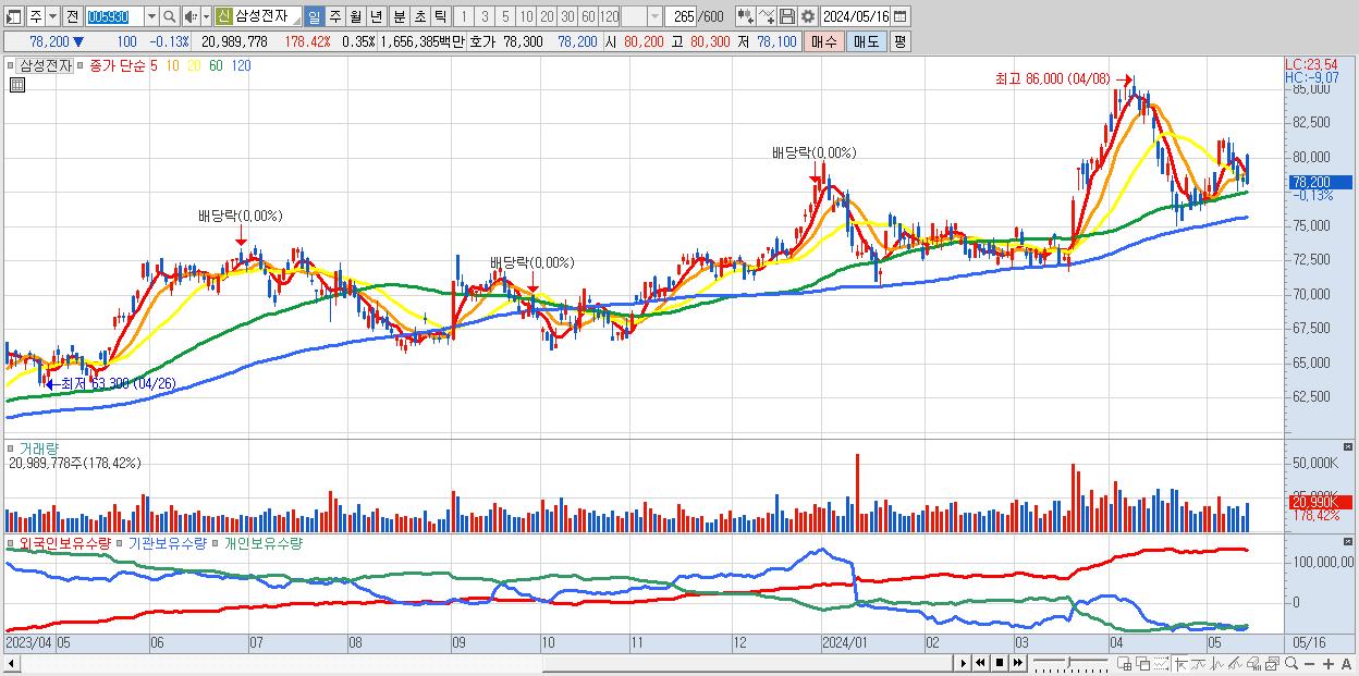 - 삼성전자 (78,200원 ▼ -0.13% , 시총: 4,668,370억, 거래량: 20,989,778, 거래대금:16,564억)