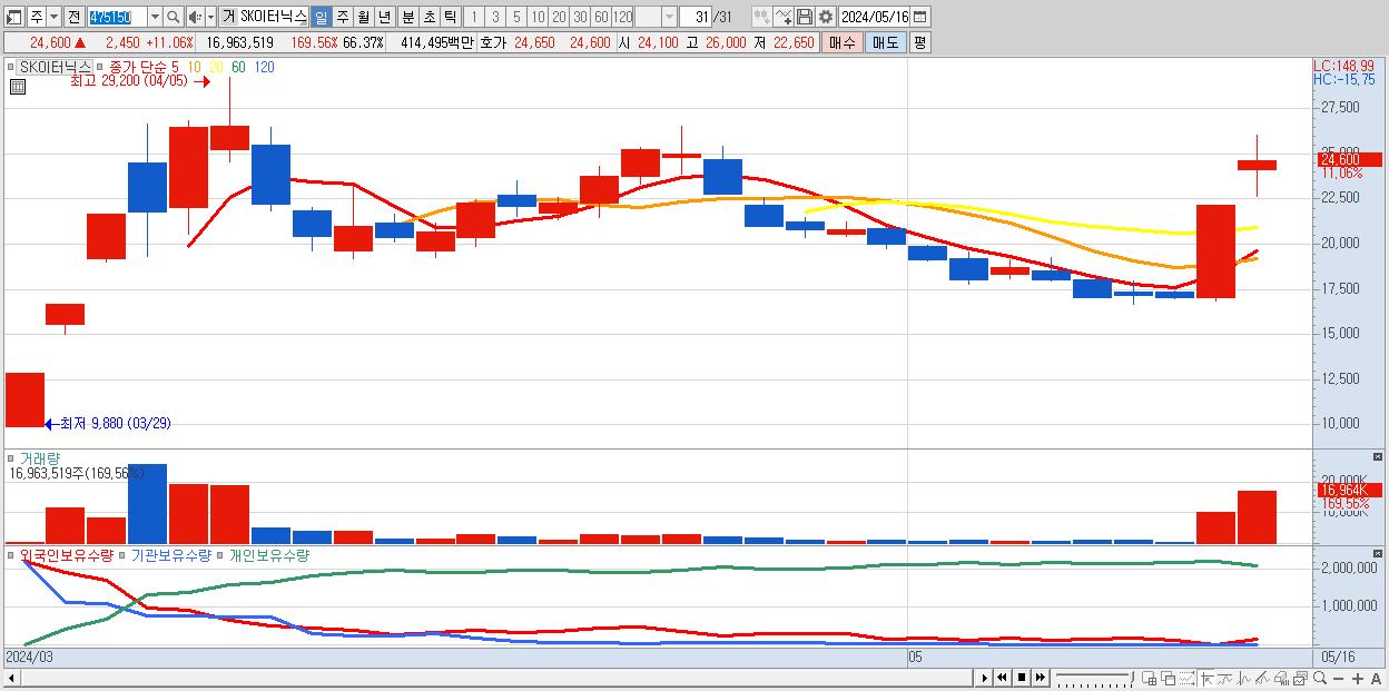 - SK이터닉스 (24,600원 ▲ 11.06% , 시총: 6,288억, 거래량: 16,963,519, 거래대금:4,145억)