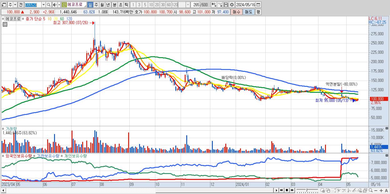 - 에코프로 (100,800원 ▲ 2.96% , 시총: 134,203억, 거래량: 1,440,646, 거래대금:1,437억)