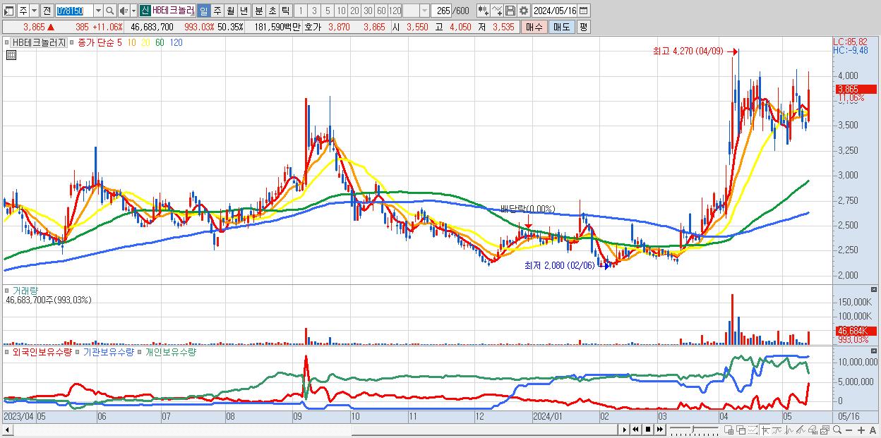 - HB테크놀러지 (3,865원 ▲ 11.06% , 시총: 3,583억, 거래량: 46,683,700, 거래대금:1,816억)