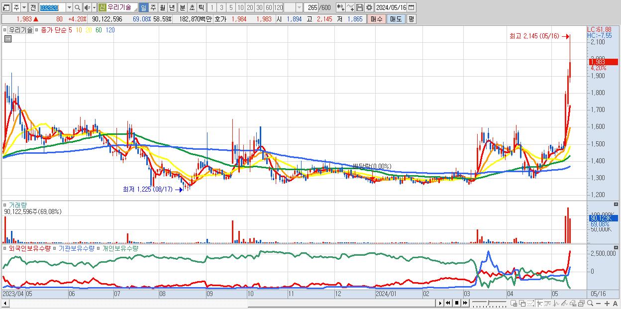 - 우리기술 (1,983원 ▲ 4.2% , 시총: 3,050억, 거래량: 90,122,596, 거래대금:1,829억)