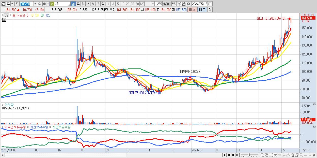 - LS (161,500원 ▲ 7.1% , 시총: 52,003억, 거래량: 815,968, 거래대금:1,285억)