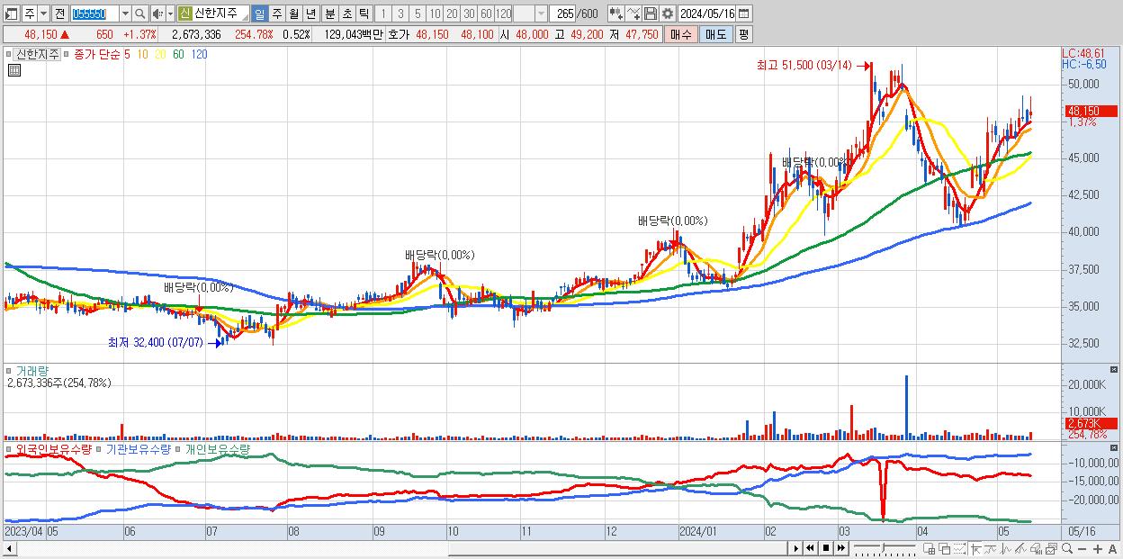 - 신한지주 (48,150원 ▲ 1.37% , 시총: 245,273억, 거래량: 2,673,336, 거래대금:1,290억)
