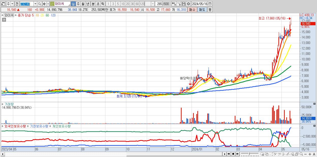 - 와이씨 (16,540원 ▲ 0.98% , 시총: 13,570억, 거래량: 14,990,796, 거래대금:2,536억)