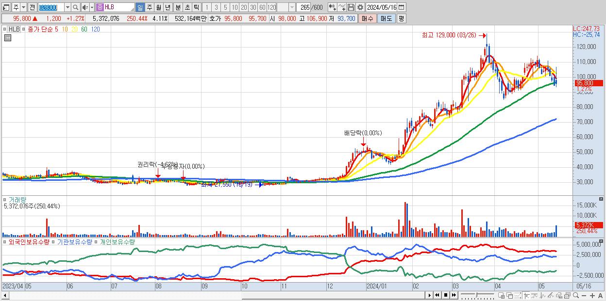 - HLB (95,800원 ▲ 1.27% , 시총: 125,335억, 거래량: 5,372,076, 거래대금:5,322억)
