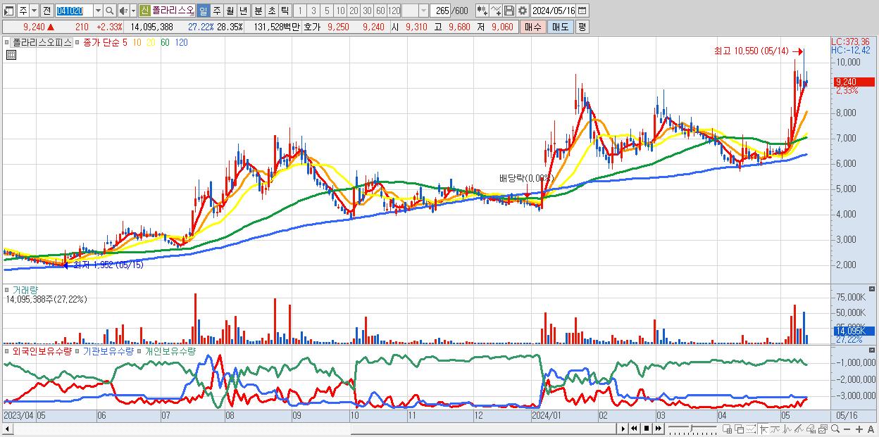 - 폴라리스오피스 (9,240원 ▲ 2.33% , 시총: 4,595억, 거래량: 14,095,388, 거래대금:1,315억)